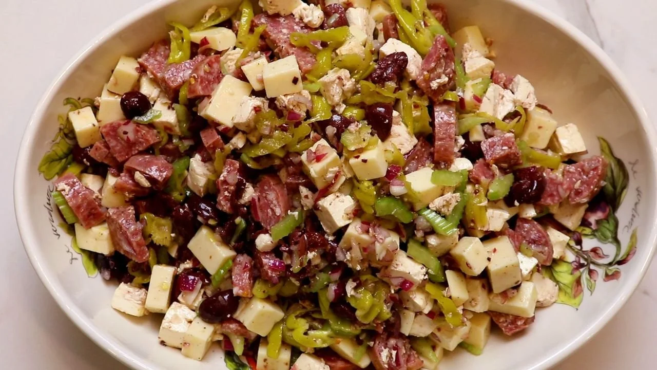 Chop all ingredients: soppressata, pepperoni/salami, olives, provolone, mozzarella, peperoncini, celery, and onion. Put all chopped ingredients into a large bowl. Add enough olive oil just so everything is coated and mix. Add a splash of white wine vinegar, pepper, garlic powder, and crushed red pepper to taste. This is one of the few recipes where we don’t add salt, as all the ingredients have enough of it! Mix everything thoroughly.