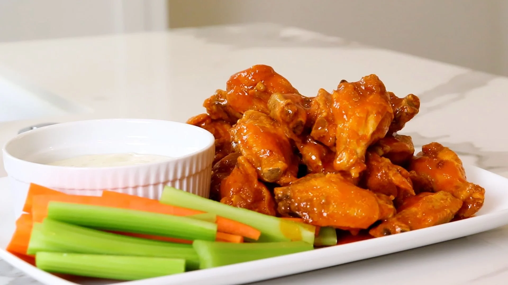 Chop carrots and celery into dipping size sticks and serve with wings and desired dipping sauce. We love a classic bleu cheese.