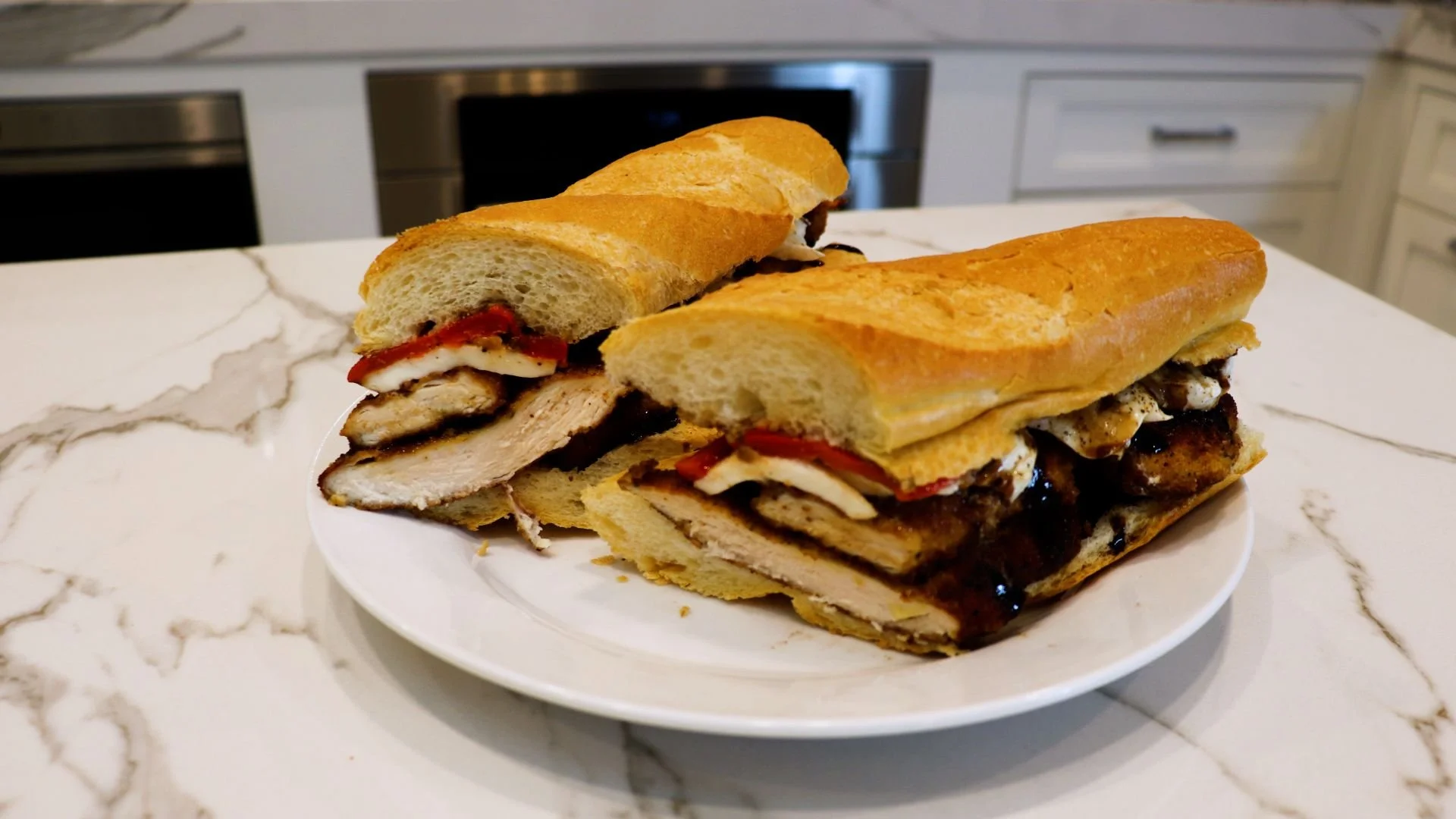 On top of your cutlets, layer sliced mozzarella and roasted red peppers. Season peppers with salt, pepper, and garlic powder. Drizzle olive oil and balsamic glaze over peppers. Take top of bread and press over sandwich.