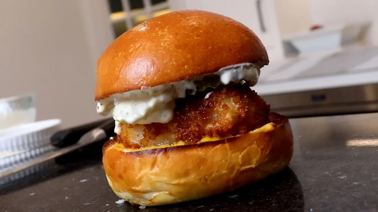 While your fish is frying, place your single slice of American cheese on the bottom half on the brioche bun. Place both sides of the bun on a baking sheet covered in foil, and slide them into the over under the broiler to lightly toast and melt the cheese. You don’t want to burn your cheese, so keep an eye on it - probably only needs a minute to melt.