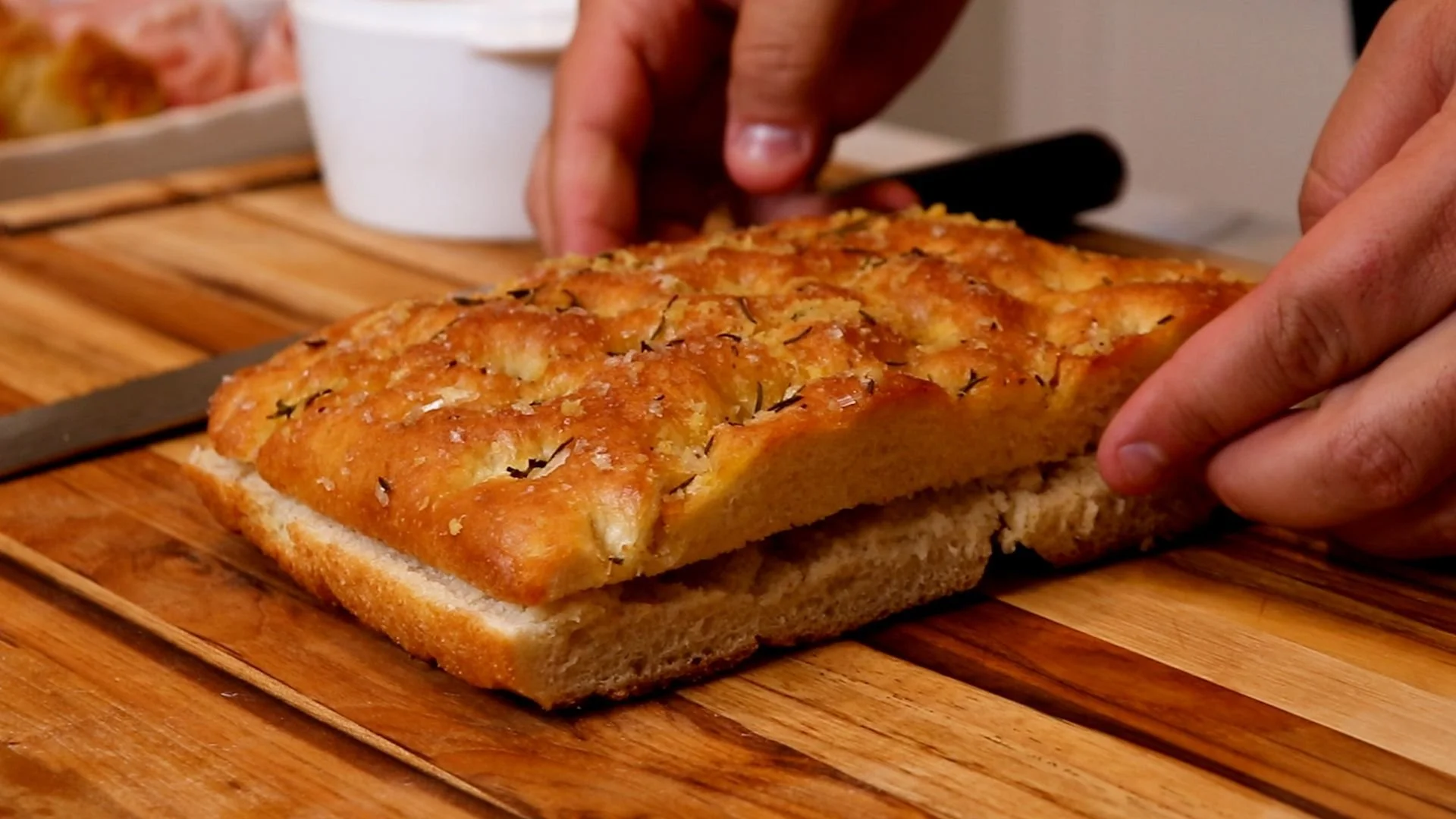 Remove the plastic wrap and drizzle the remaining 2 tablespoons olive oil over the dough. Rub your hands with olive oil, then use your fingers to make indentations across the surface of the dough, pressing through the dough to the pan. Sprinkle with flaky sea salt and rosemary. Bake for 20 to 30 minutes, or until golden brown.