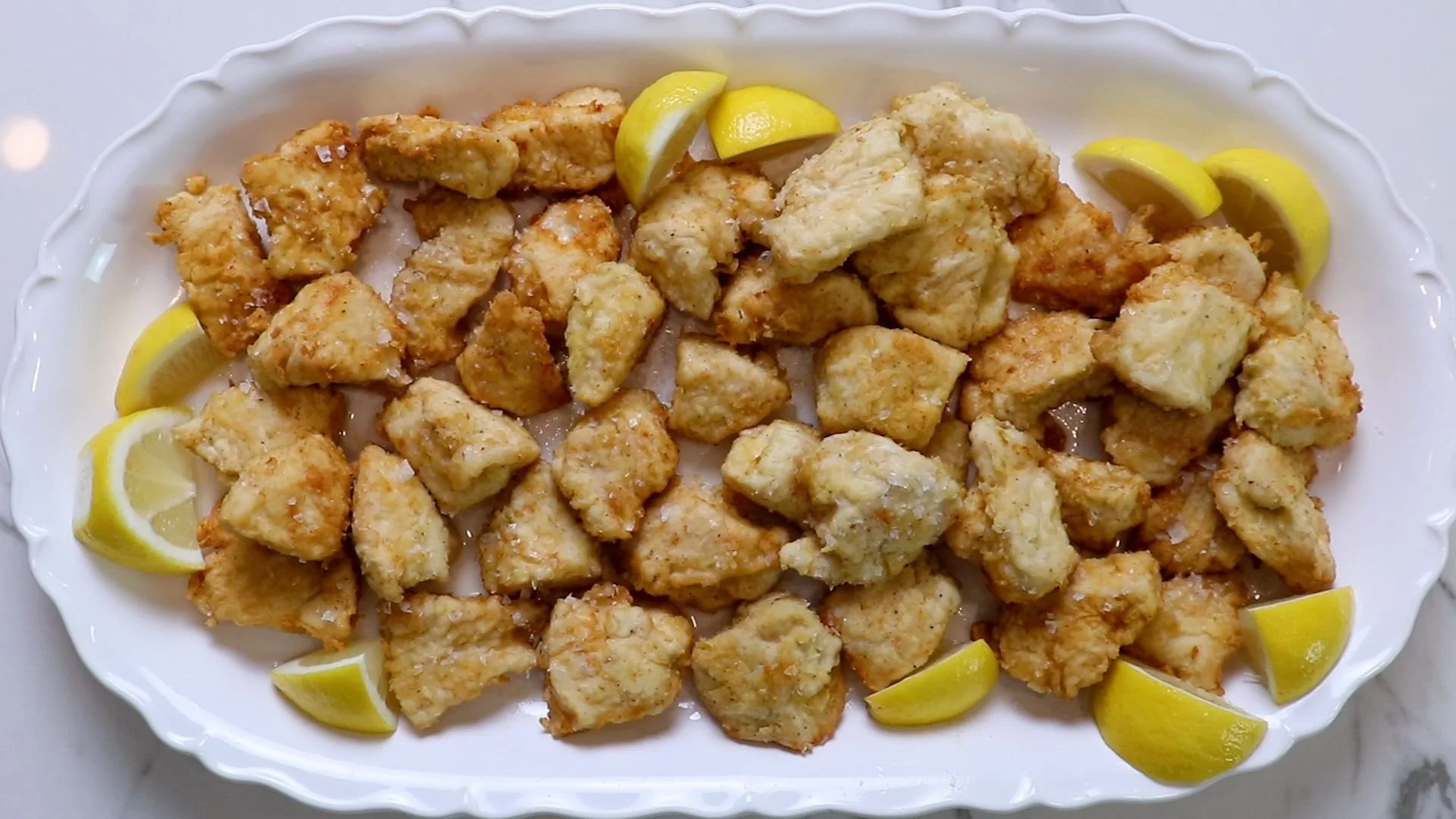 Repeat this process until all chicken nuggets are cooked. Serve on a large platter with lemon wedges for garnish.