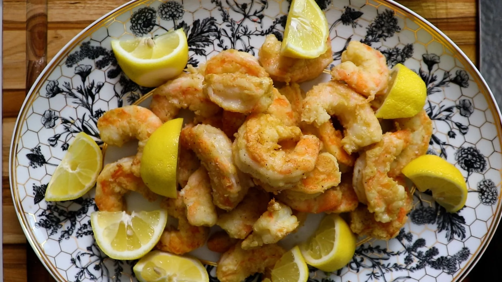 Dredge shrimp in egg wash so all pieces are fully coated. Then dredge shrimp in flour mixture until fully coated, shaking off excess flour. Remove floured shrimp to a tray or plate until all pieces have been coated in the egg and flour mixture.