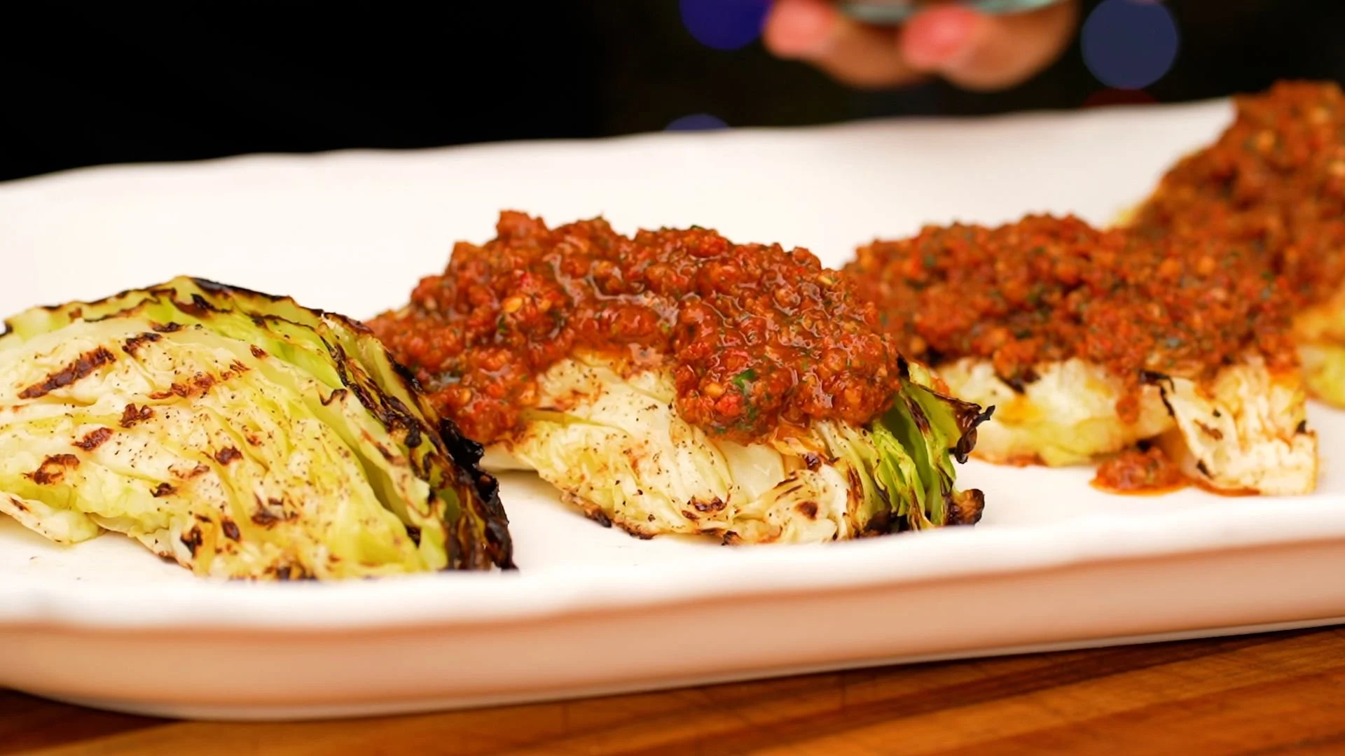 Heat grill to 400 degrees. Place cabbage on the grill. Cook for about 5 minutes on each side until tender and charred.
