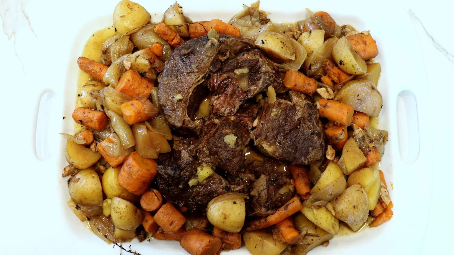 Remove pot from oven and spoon roast and vegetables onto a serving platter and serve to admiring guests!