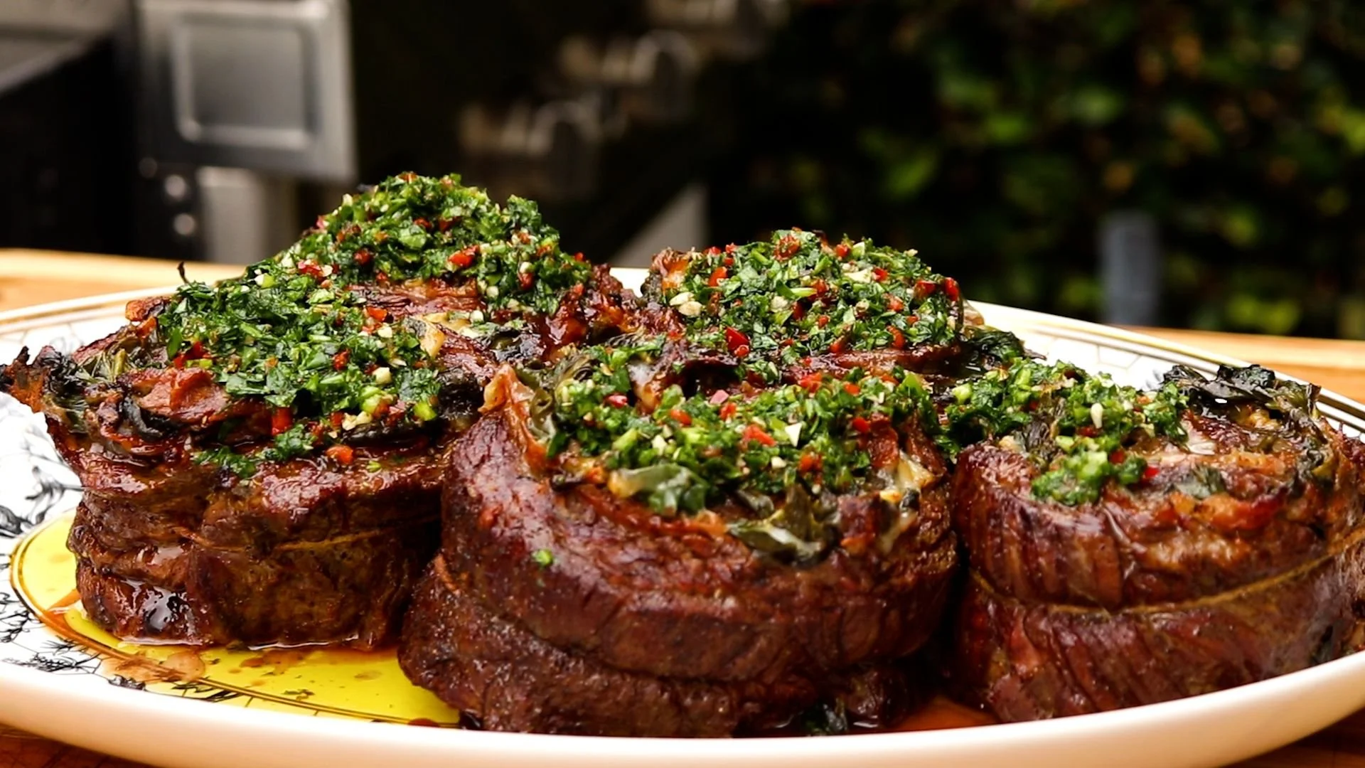 Remove grilled pinwheels onto a large serving platter. Garnish each piece with the chimichurri sauce and serve! We typically cut each pinwheel in half per serving.