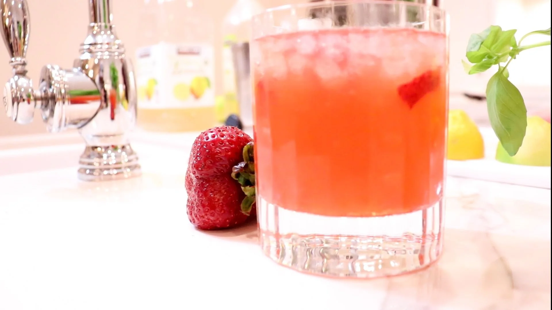 In a cocktail shaker, add a few slices of strawberries and a couple basil leaves. Squeeze juice from half a lemon into the shaker and muddle ingredients. Once muddled, squeeze about a tsp. of strawberry puree into the shaker. Add a little ice and then add your vodka. For this cocktail, pour vodka for a 4-second count. Add the same amount of lemonade. Shake ingredients well and strain over ice in a cocktail glass of your choice. For this cocktail, we like a rocks glass. Garnish with a strawberry slice and basil leaf.